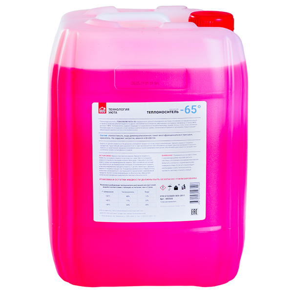 Теплохладоноситель «Технология Уюта-65» предназначен для использования в качестве низкозамерзающего теплохладоносителя в закрытых системах отопления, вентиляции и кондиционирования жилых и производственных зданий, для систем охлаждения производственного оборудования, чиллеров, холодильных агрегатов и т.д., работающих в тяжелых климатических условиях, где в качестве конструкционных материалов используются сталь, чугун, алюминиевые сплавы, медь и её сплавы.